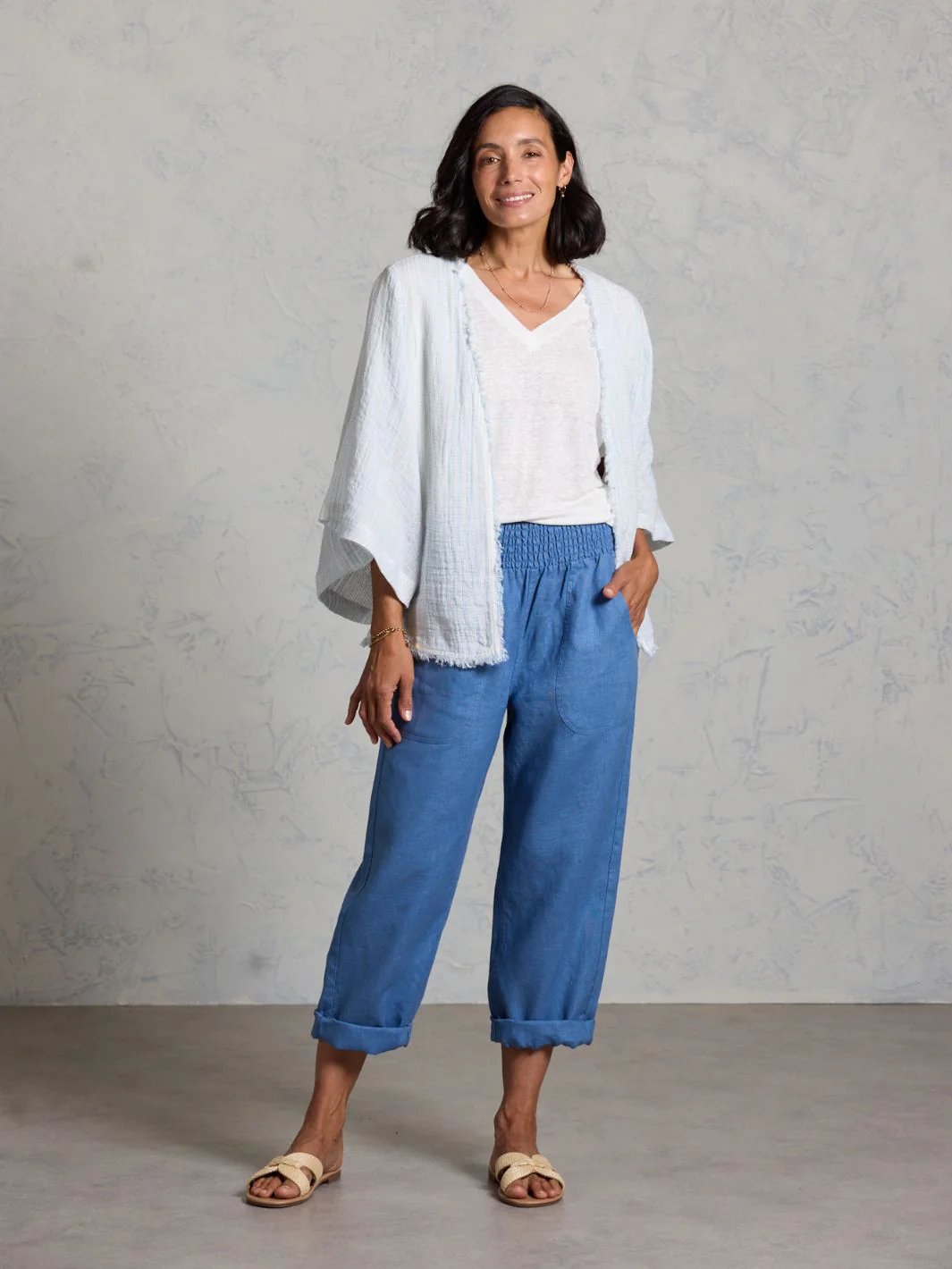 Crafted from lightweight 100% OEKO-TEX® STANDARD 100 French linen, the Coastal Shrug features a crinkle gauze fabric with a delicate overweave that creates soft, natural texture. A relaxed square silhouette with wide 3/4-length sleeves drapes effortlessly, while raw edge detailing along the centre front and hem adds a laid-back coastal finish.