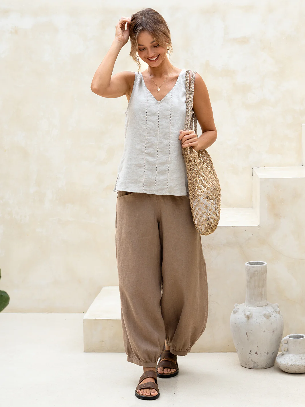 Sustainably crafted from lightweight OEKO-TEX® STANDARD 100 French Linen, our Giana Top features an effortless yet refined silhouette, perfect for all year long. This piece is styled with a flattering V neckline, subtle lace detailing, and an elegant, curved hemline for a chic and minimalistic look, while side slits offer ease of movement for all-day comfort.
