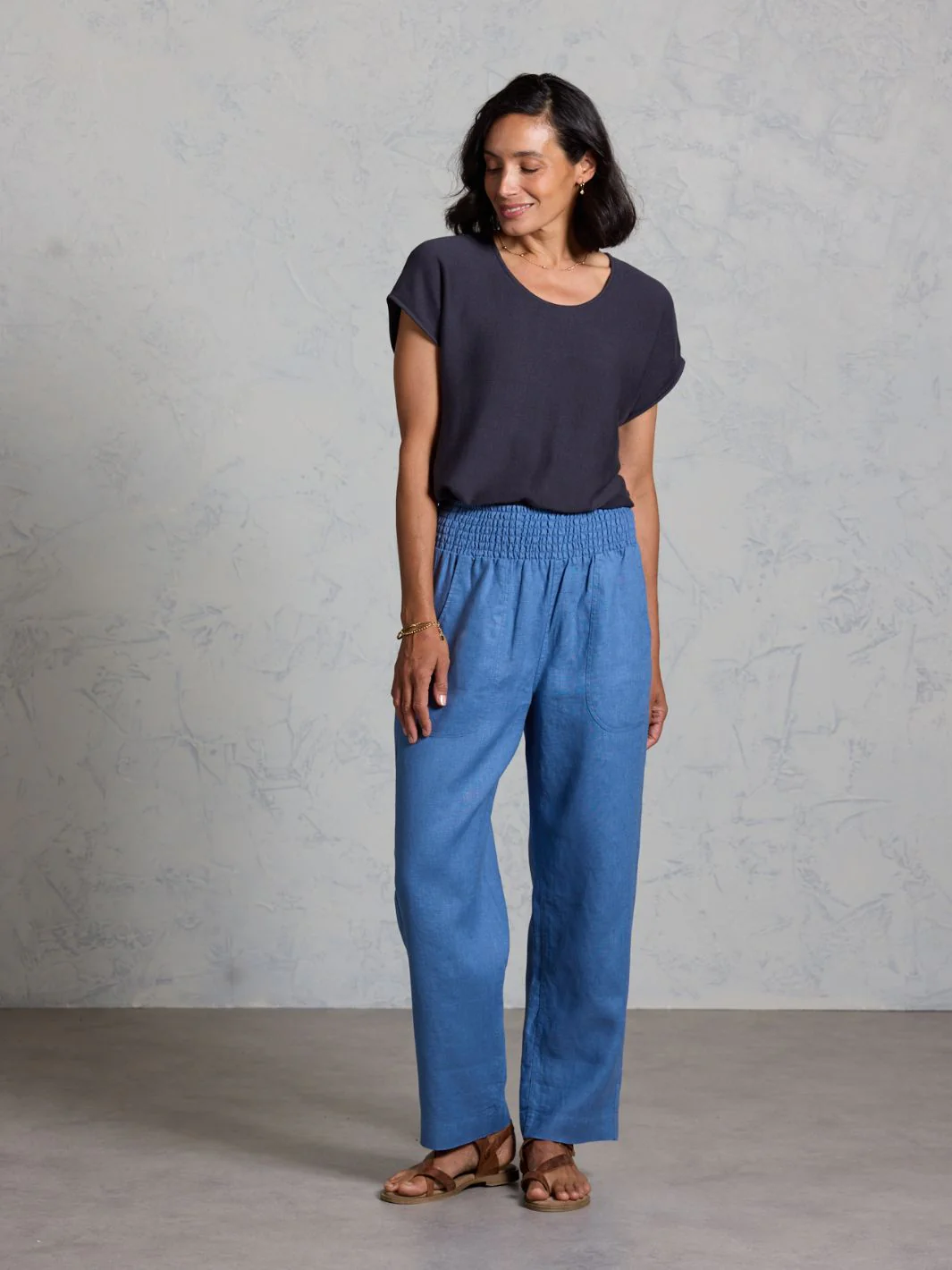 Crafted from 100% OEKO-TEX® STANDARD 100 French linen, our Nautical Pants feature a relaxed straight-leg silhouette and a concealed internal button to secure rolled-cuff styling. A comfortable shirred waistband adds ease and versatility, making them an effortlessly stylish choice for days on the move or relaxed travel.